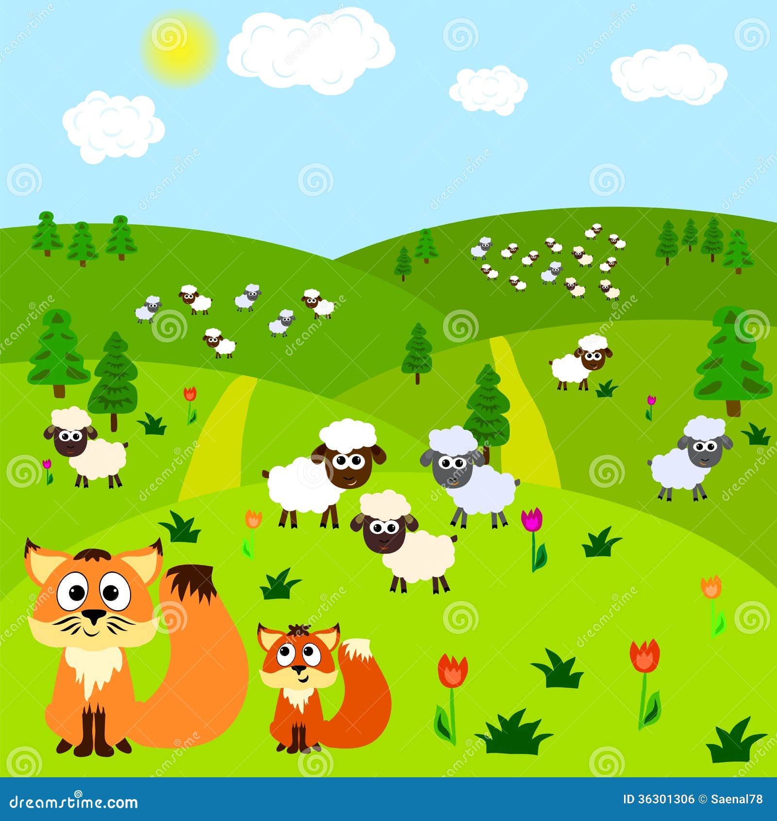 Cartoon Background With Fox And Sheeps Stock Vector